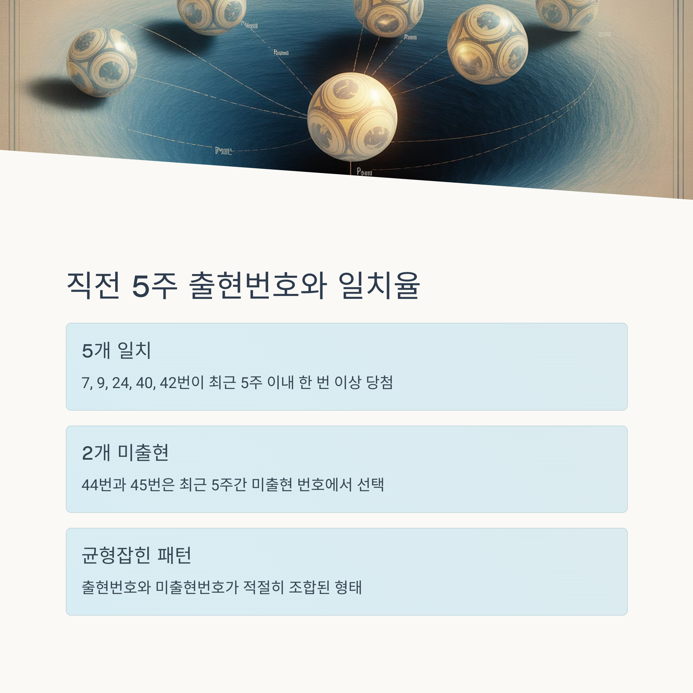 반면 44번과 45번은 최근 5주간 미출현 번호에서 선택되었습니다. 이는 출현번호와 미출현번호가 적절히 조합된 균형잡힌 패턴으로 해석됩니다.