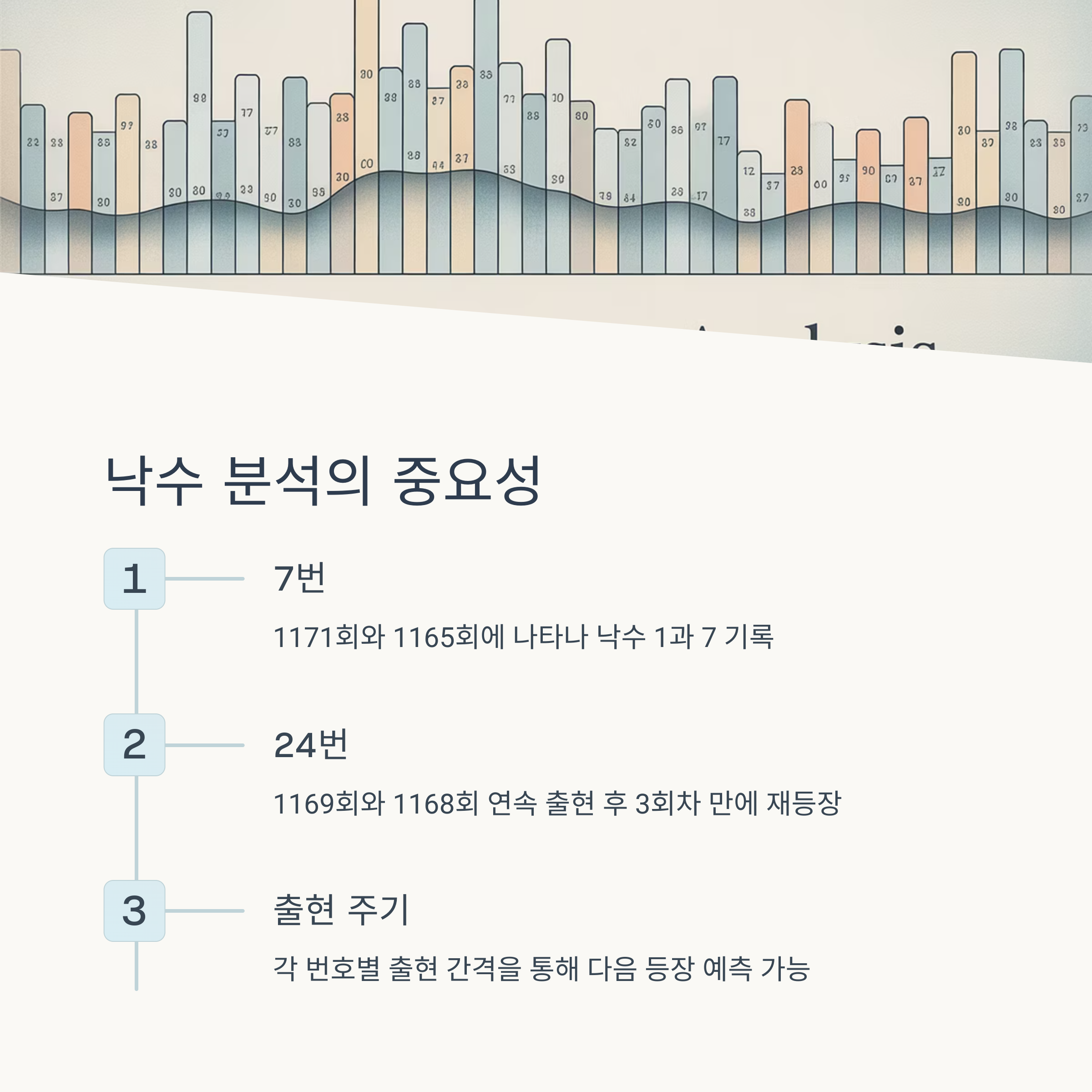 24번은 1169회, 1168회, 1172회에 연속으로 나타났으며, 42번 역시 1169회, 1170회, 1172회에서 확인됩니다. 이러한 높은 출현 빈도는 해당 번호들이 현재 활발한 주기에 있음을 의미합니다.