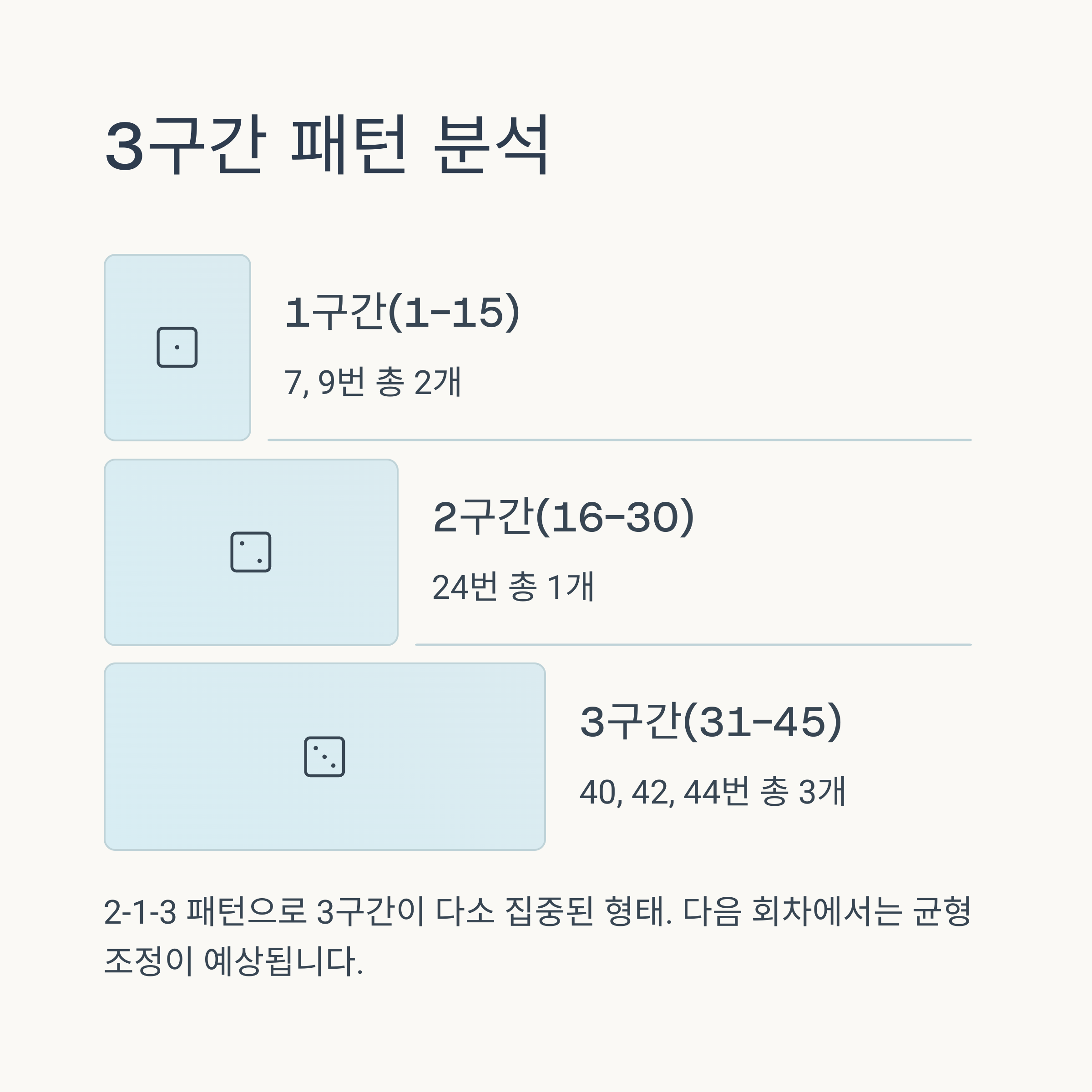이는 2-1-3 패턴으로 3구간이 다소 집중된 형태입니다. 일반적으로 각 구간에서 2개씩 균등하게 나오는 경우가 많으므로 다음 회차에서는 균형 조정이 예상됩니다.