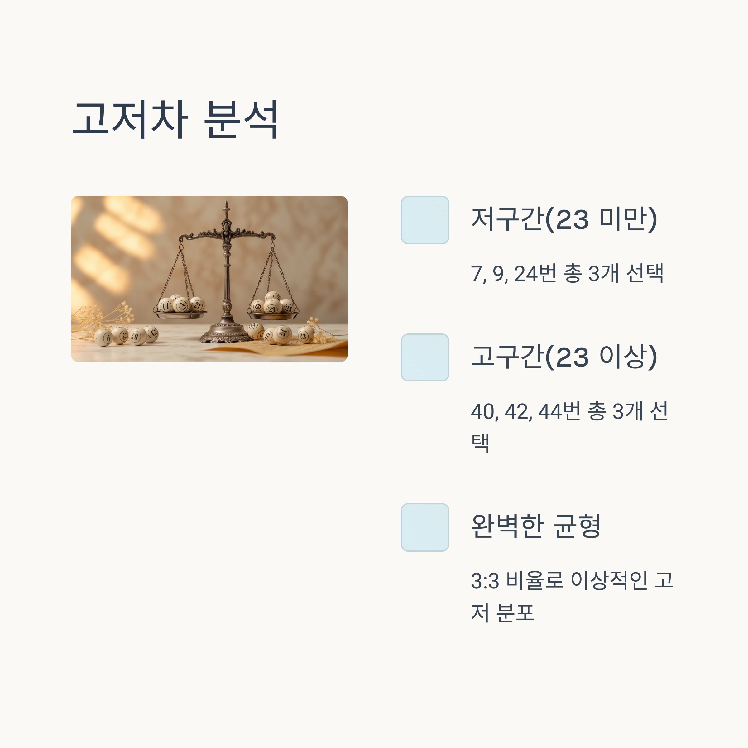 23을 기준으로 23 미만을 저(低), 23 이상을 고(高)로 분류하여 분석합니다. 1172회에서는 저구간에서 3개(7, 9, 24), 고구간에서 3개(40, 42, 44)가 선택되어 3:3의 완벽한 균형을 보였습니다.