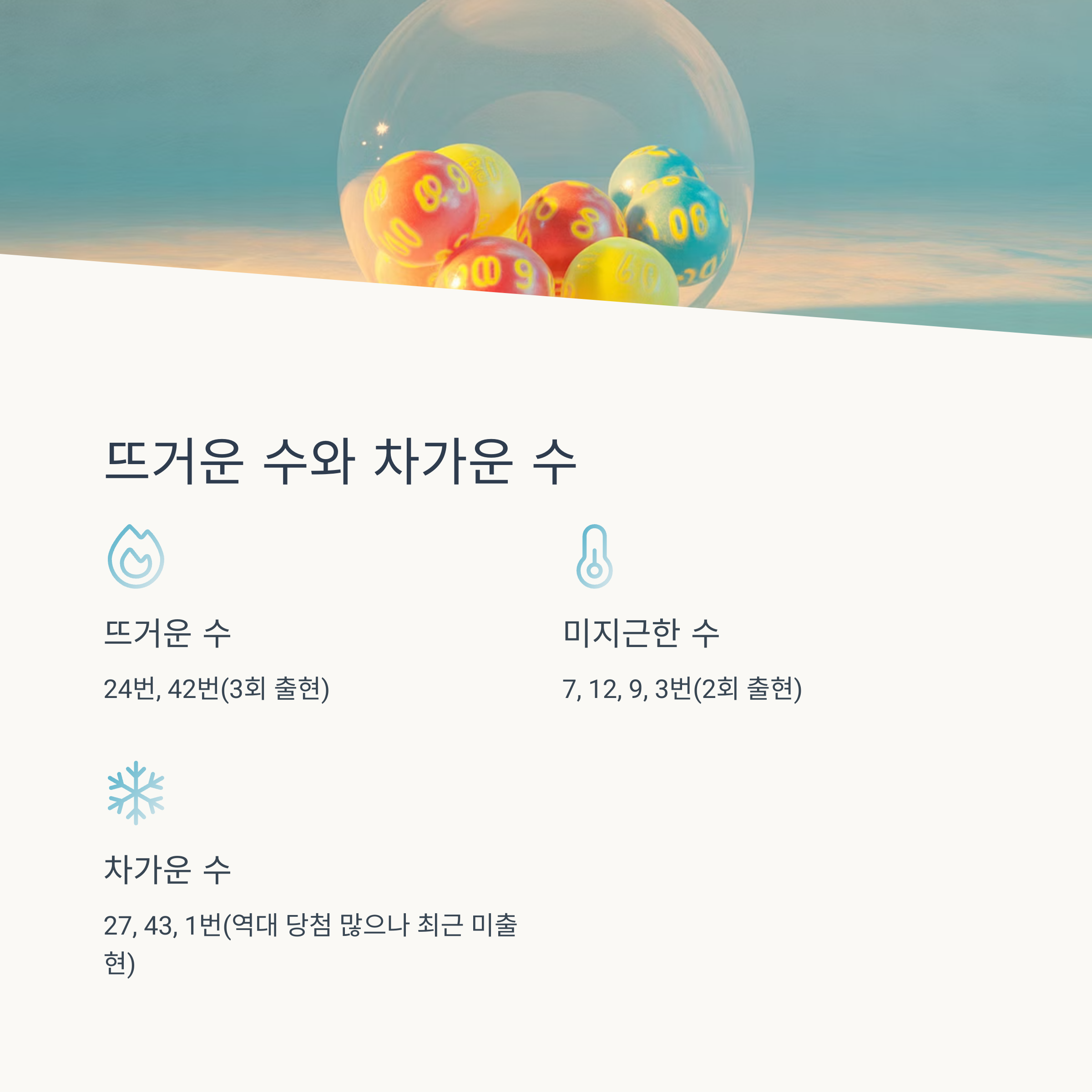 7, 12, 9, 3번이 2회 출현으로 미지근한 상태를 보이고 있습니다. 차가운 수 중에서는 27, 43, 1번처럼 역대 당첨횟수가 높은 번호들이 주목됩니다.