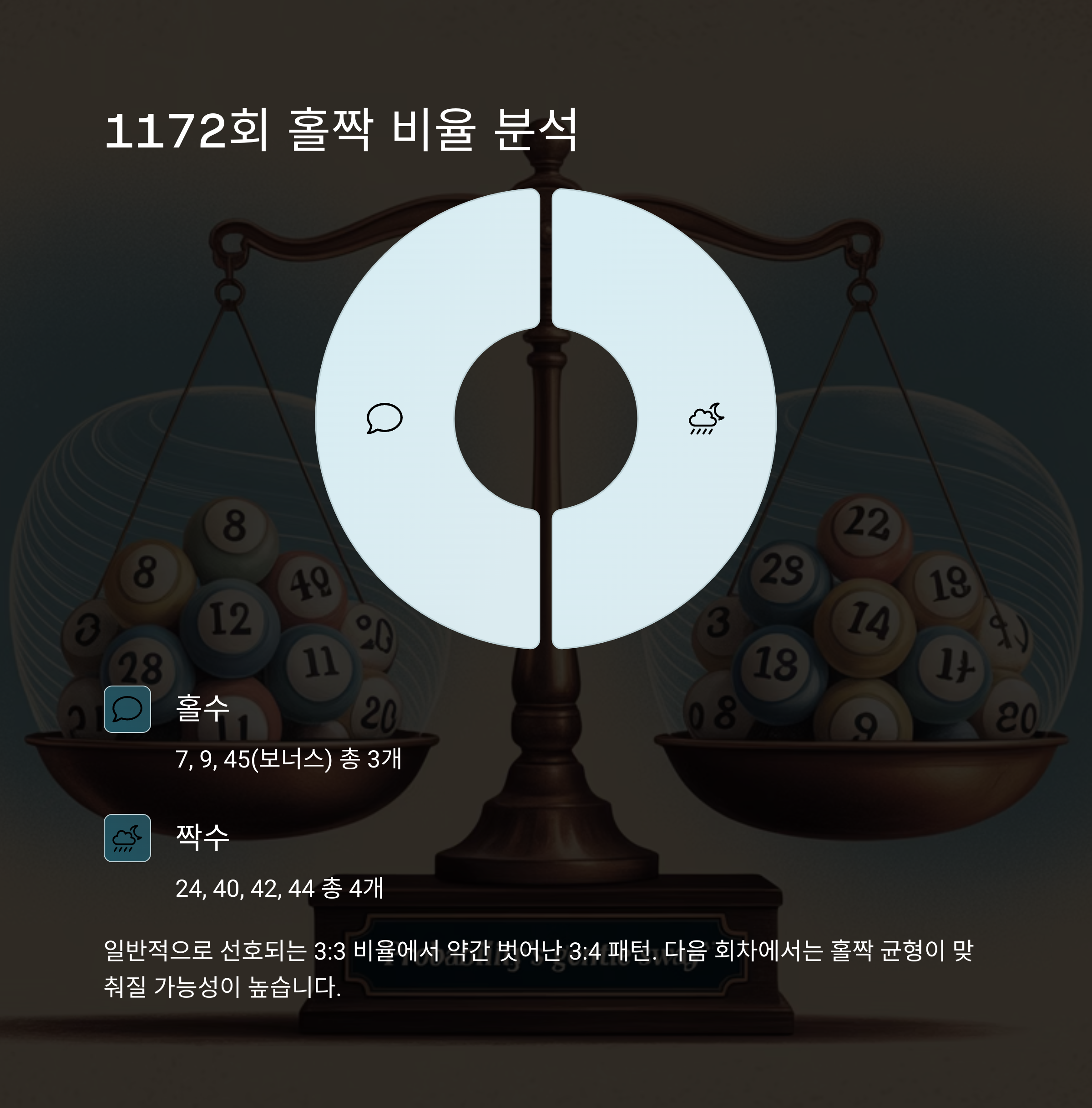 1172회 당첨번호 7, 9, 24, 40, 42, 44와 보너스 45번의 홀짝 비율을 분석해보겠습니다. 홀수는 7, 9, 45로 3개, 짝수는 24, 40, 42, 44로 4개가 선택되었습니다.